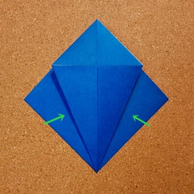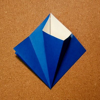 【23】 同じように、他の3か所のひし形の面も、左右の角を中心線にそって上側で合わせて折ります。