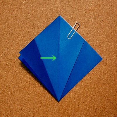 【4】 下の中央の角を、左右の角を結ぶ線で上側に折ります。