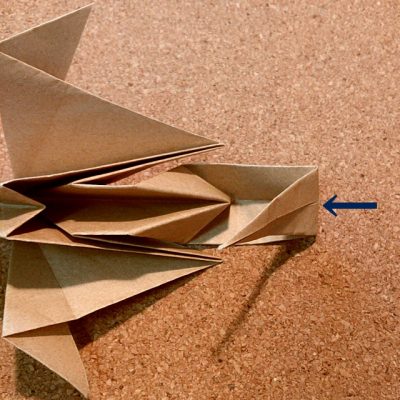 【18】 半分に折った部分を開き、矢印の部分を袋状に開いて内側へ入れ込みます。