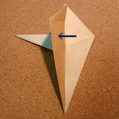 【13】 開いた上の角を大きく下側に倒し、左側が右に来るようにたたみます。