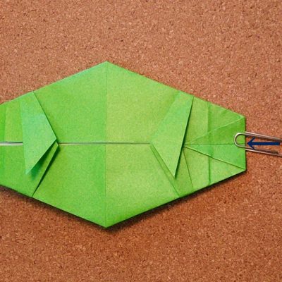 【26】 横の中心線を谷折りで半分に折ると、頭と口のある胴体の完成です。