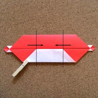 【13】 折り上げた白い部分の角の位置に合わせて、両側を順に内側にたたみます。