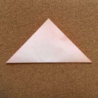 【2】 赤色の面を内側にして、三角になるよう半分に折り、折りすじをつけてひろげます。