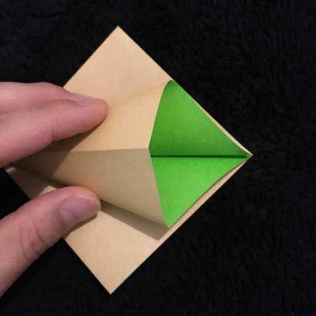 【2】 90度紙を回してもう一度三角に折って広げます。