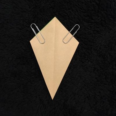 【9】 ひらひらしている部分を折り下げ、両角を裏側に山折りします