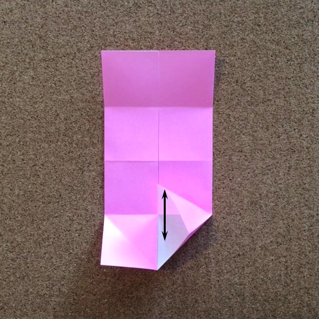 【23】 三角の部分を、下の位置に合わせるようにして折り返します。