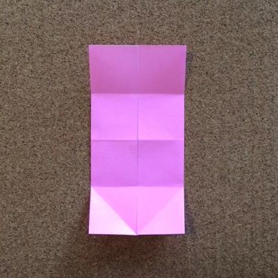 【5】 下の両角を、中心線にそって合わせて折り、折りすじをつけて戻します。