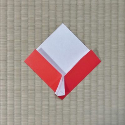 【9】 赤い部分を左右下の辺に合わせて折り目を入れます。