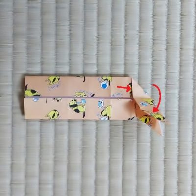 【6】 再び上下を中央の線に合わせて折って裏返します。