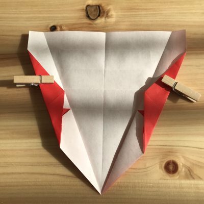 【16】 裏返して、上面を矢印の線で下に折り下げます。