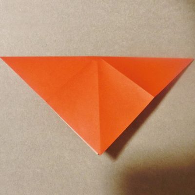 【23】 折ったところを一度起こして、手前の三角の向こう側に折り入れます。