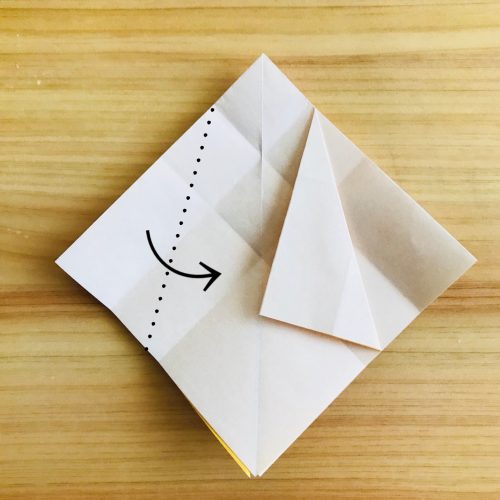 その時に、点線の折り目で少し外側に広げるように折っていきます。