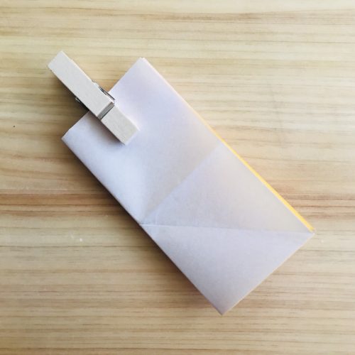 【3】 裏返して、長方形になるように縦半分に折り、折り目をつけたら戻します。